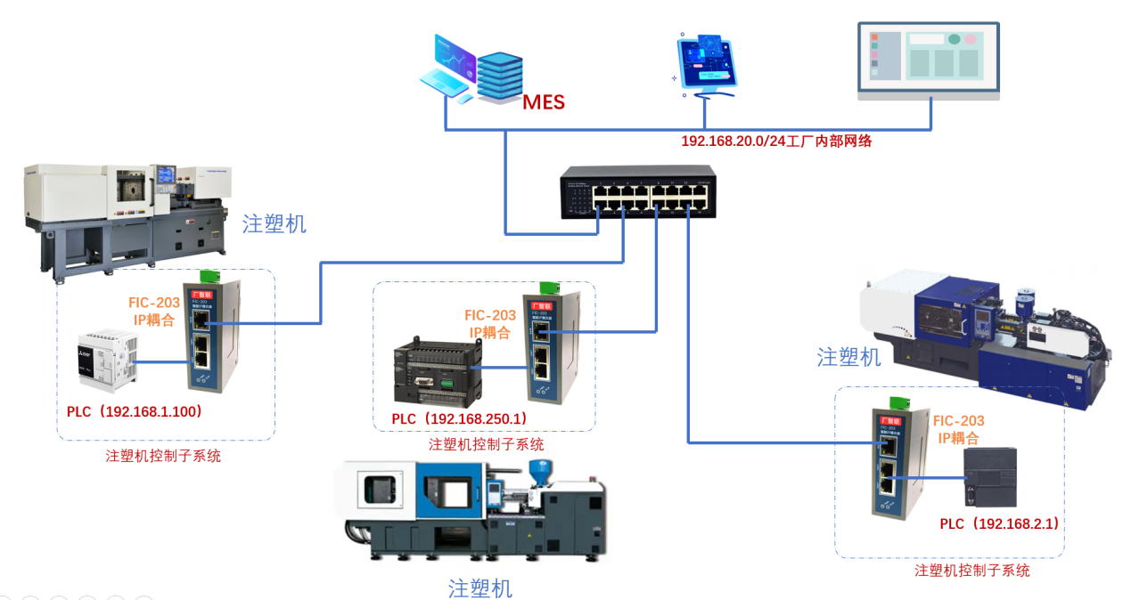 位于上海的某塑料件生产工厂,工厂内使用多个品牌的塑料机械完成生产塑料零配件任务。目前工厂需要提升信息化管理水平,部署mes系统,实现统一生产决策。mes系统需要与所有的塑机控制系统联网通信。目前厂内塑机就有3个品牌,还有部分自研配套控制设备,总计plc和控制设备40余套,各品牌塑机的控制plc品牌型号也不尽相同,其ip网络参数既有冲突的,又有不再一个子网的,最后需要完成统一入网。甲方工厂的工程师联系了各个塑机厂家提出了更改这些设备的ip的诉求,但塑机设备厂家的回复也让工厂打消了更改ip的想法,因为更改ip参数可能需要设备停机耽误生产、后续维护交接也会受影响、有些还需要收一定的费用。经过前期的技术沟通,驿唐的小伙伴直接将fic-203带到工厂现场,帮助他们解决联网问题,同样是通过fic-203隔离plc内部网络,对外则直接使用mes系统网络分配的ip即可,这样让所有设备接入mes网络都不需要更改现有ip地址。一劳永逸的解决信息化改造联网问题。